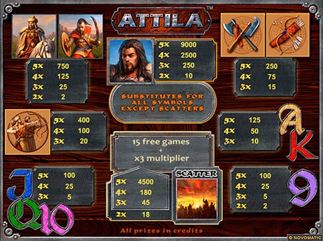 В игровом аппарате Attila картинки крутятся вместе с 5 барабанами. Для игры предоставляются 9 линий, которые устанавливаются в индивидуальном порядке.