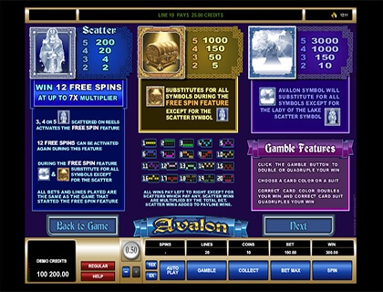 Особенностью игрового автомата Avalon считается возможность запускать игровой процесс бесплатно без предварительной регистрации. 20 игровых полос ставит игровой автомат на порядок выше, чем такие разработки, как Crazy Monkey , Lucky Pirates, Fruit Cocktail , Garage и др.