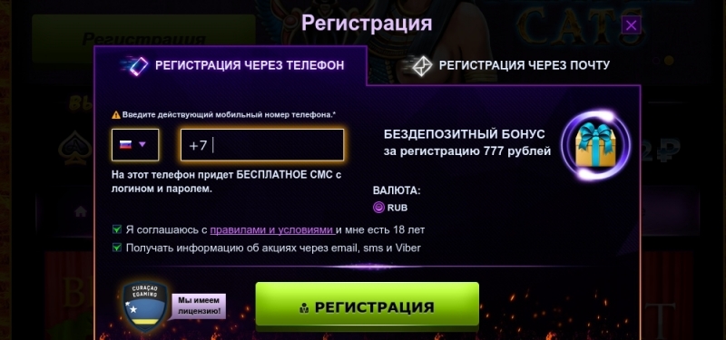 👑 В казино можно получить бонус при регистрации до 777 рублей. Чтобы забрать свой бездепозитный бонус за регистрацию новому пользователю нужно зарегистрироваться. Как это сделать описано ниже.