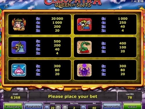 - Ознакомиться с правилами и выплатами видео слота Клеопатра – королева слотов поможет клавиша More info