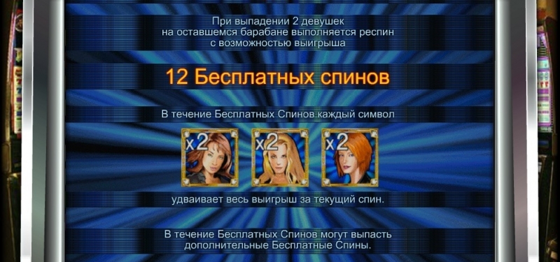 Фри спины запускаются 3 символами разбросами. Красивые девушки предлагают игрокам 12 дополнительных вращений. Если на экране появляются лишь 2 красавицы, то автомат самостоятельно крутит барабаны в поисках третьей девушки.