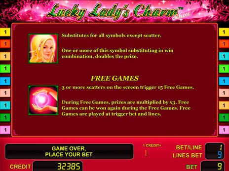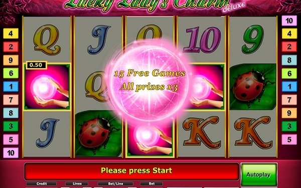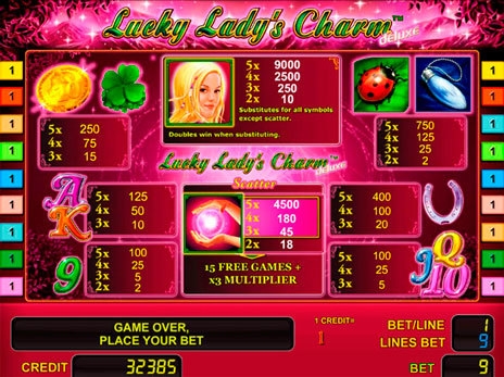 Видео слот Lucky Ladys Charm – отличная разработка компании Novomatic. Положительные отзывы постоянных клиентов лишь подтверждают качество игровой модели автоматов. В процесс игры можно задействовать 10 активных полос. Это отличает видео слот от таких автоматов, как King of cards, Fruit Cocktail , Garage , Crazy Monkey и др. Максимальная выплата составляет 9 000 бесплатных ставок. Такими щедрыми вознаграждениями не могут похвастаться такие автоматы, как La Fiesta, Wild West, Party Line и прочие.